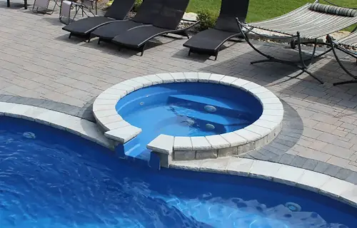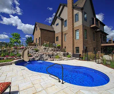 Go big when you go home to your backyard swimming pool that has a splash pad, a built-in spa and an eight-foot deep end suitable for the use of a diving board – or just jumping into. This is one of our biggest inground fiberglass swimming pools and it offers big family fun.